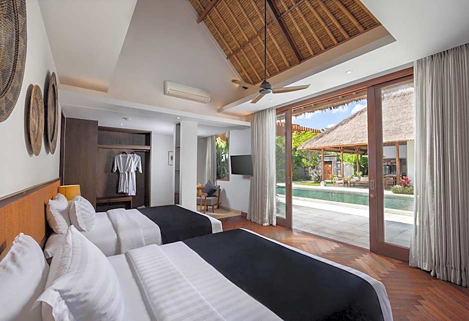 This is interconnected 2-bedroom villa and 3-bedroom villa. All bedrooms are air-conditioned. Guests enjoy a private pool. Extra bed can be accommodated for children up to 12 years old.